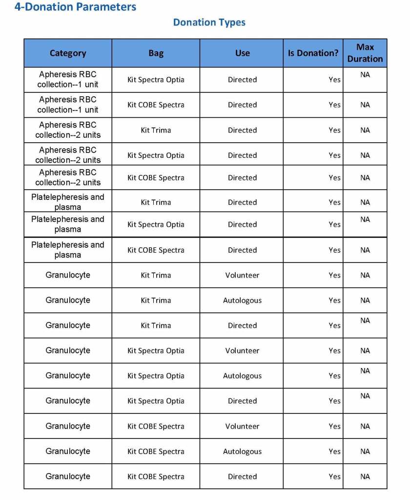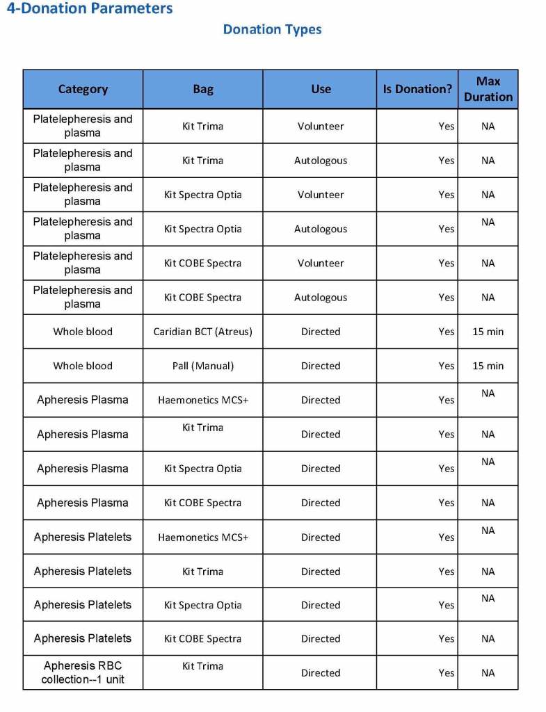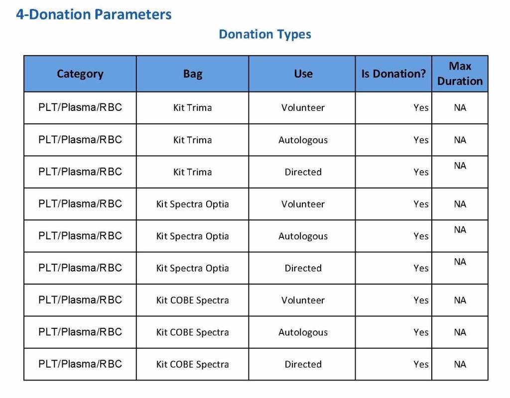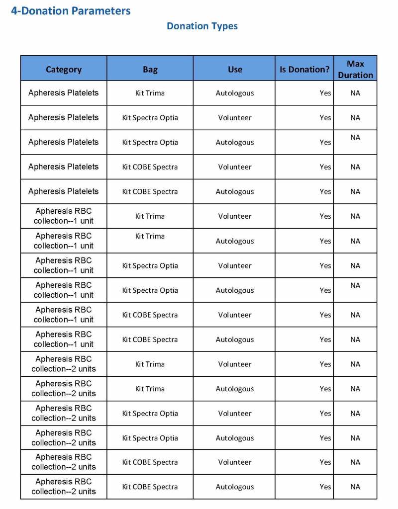 - Machine parameters if indicated (e.g. fraction of cells remaining FCR, target hematocrit, unit hematocrit for RBC exchanges)
