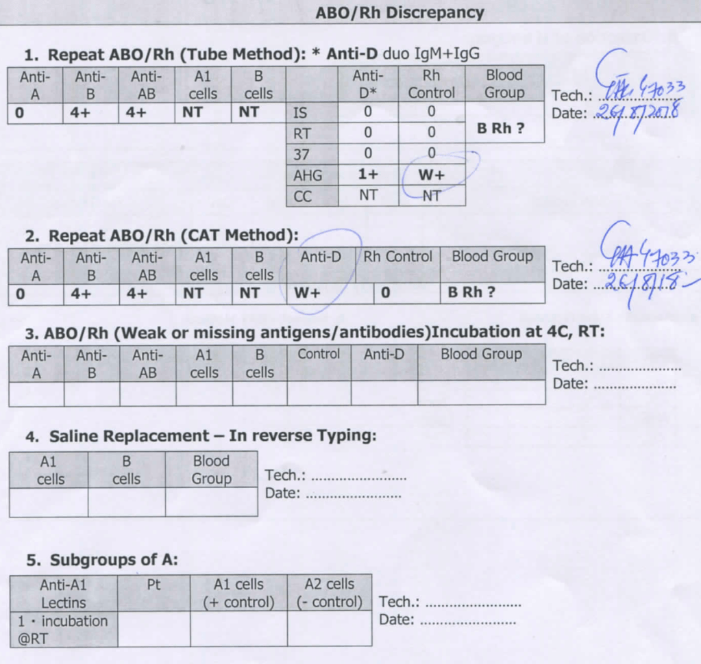 - Complex immunohematology testing and specimens showing aberrant results (e.g. ABO/D discrepancies) are reviewed by the supervisors or designates and ultimately a transfusion medicine physician before authorization.