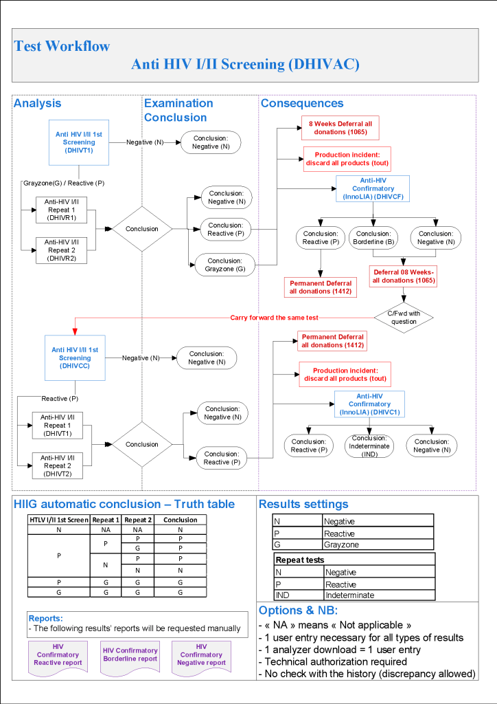 As I designed this in Medinfo, this is algorithm uses an HIV- /HIV-2 antibody EIA screening test, HIV p24 antigen test, and a confirmatory linear immunoblot assay LIA that can discriminate between type HIV-1 and type HIV-2. If there is an indeterminate result, a repeat test is ordered after 8 weeks. A reentry protocol is also included (1.6.3 below).