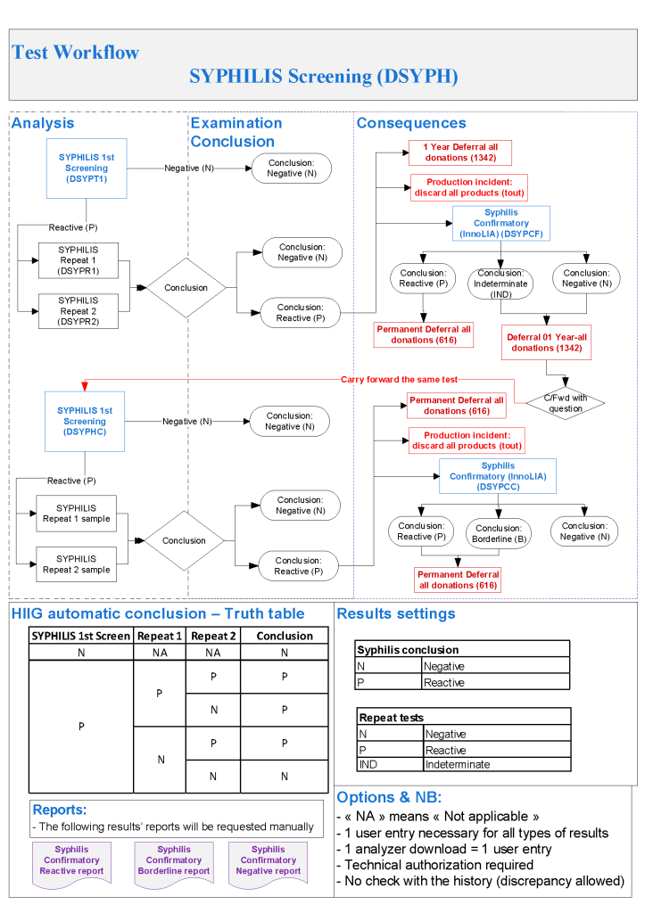 Syphilis testing uses a screening test (we used an EIA methodology to detect cardiolipin) and a confirmatory test a syphilis linear immunoblot assay LIA.