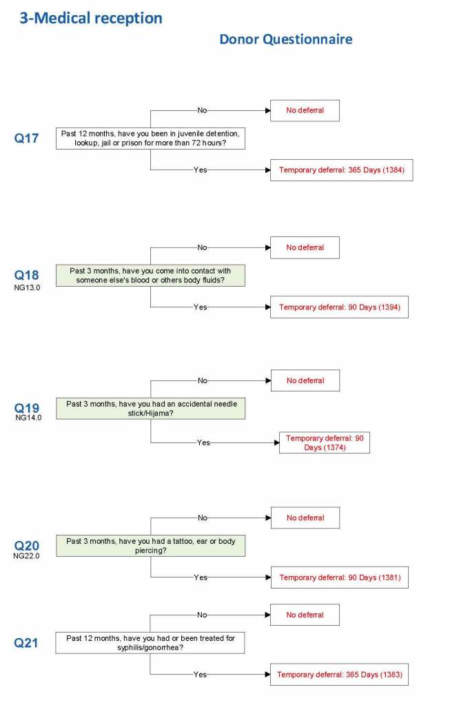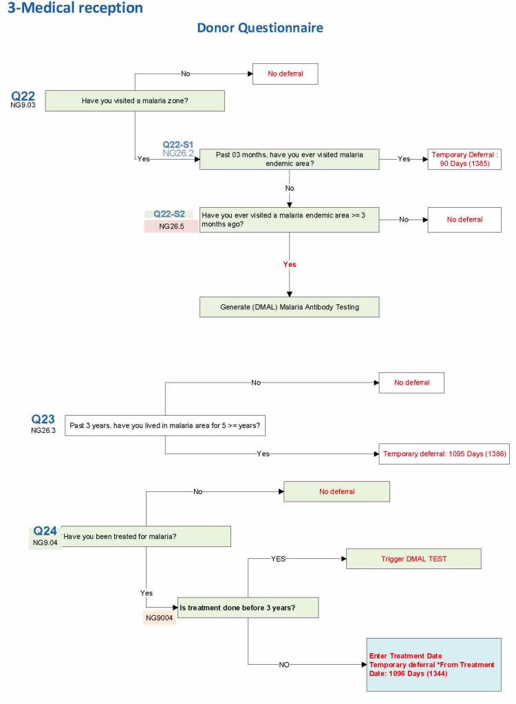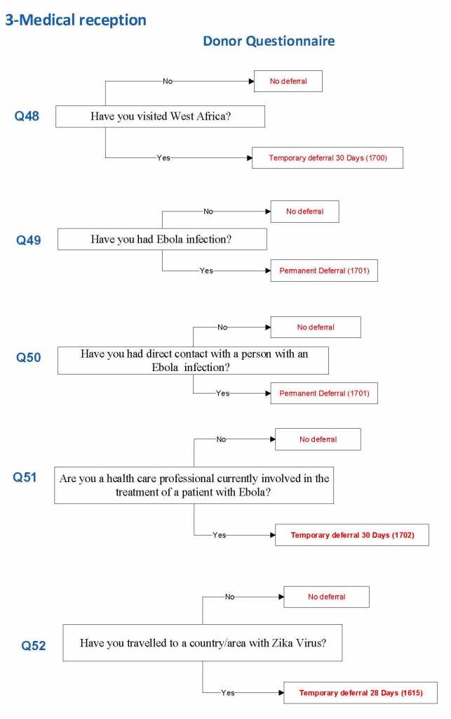 I started building this using the Uniform Donor Questionnaire UDQ from the AABB;Â however, I modified it to include coverage for Chikungunya, Zika, etc. and to include enhanced processes for malaria based on the Australian Red Cross.