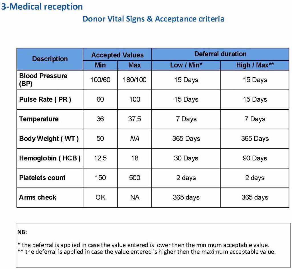 The donor physical examination includes the vital signs (blood pressure, pulse, temperature, heart rate, and temperature). I have attached a sample set of criteria for review. All are user-definable. Note how the arm examination is also included (looking for scarring, skin lesions, etc.)