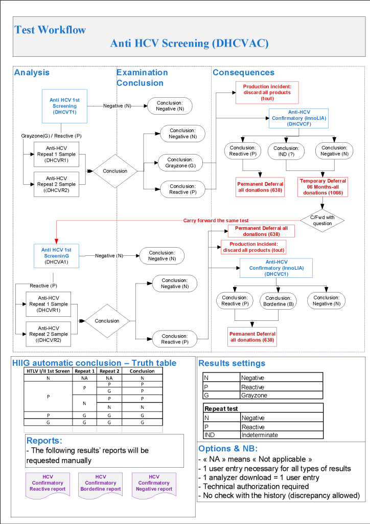 The testing algorithms may trigger additional testing, repeat of current testing at some future date, or permanent deferral. One of the most complex processes is for HCV testing. The following criteria are based on US FDA CBER guidelines, but are modified for the availability of test methodologies not licensed in the USA.