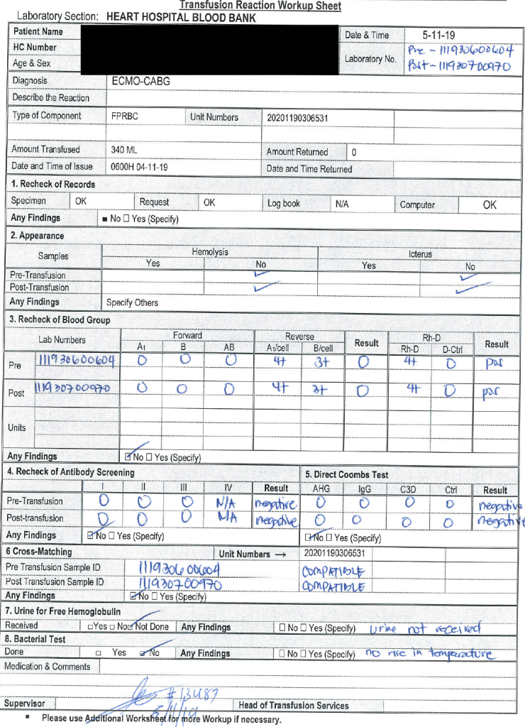 The attached form was designed by my staff and me based on my experiences at several institutions. It organizes the workup and helps ensure that all the testing and checks are performed. The clinical area calling the reaction will provide a transfusion form that includes the vital signs (pre-, post-, and during the transfusion) as well as the symptoms.