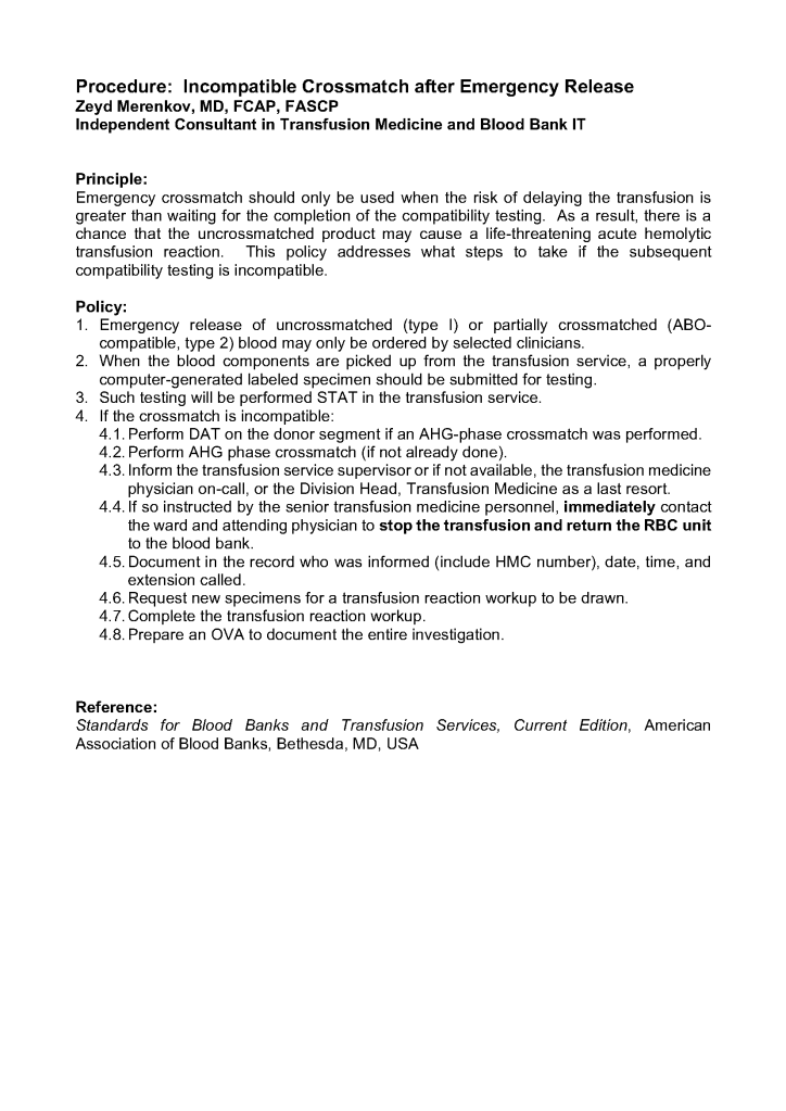 Patient Procedure: Incompatible Crossmatch after Emergency Release Image30th Jul 202111th Jun 2021 drzeyd Share this: Click to share on LinkedIn (Opens in new window) LinkedIn Click to share on X (Opens in new window) X Click to share on Facebook (Opens in new window) Facebook Like Loading... Related