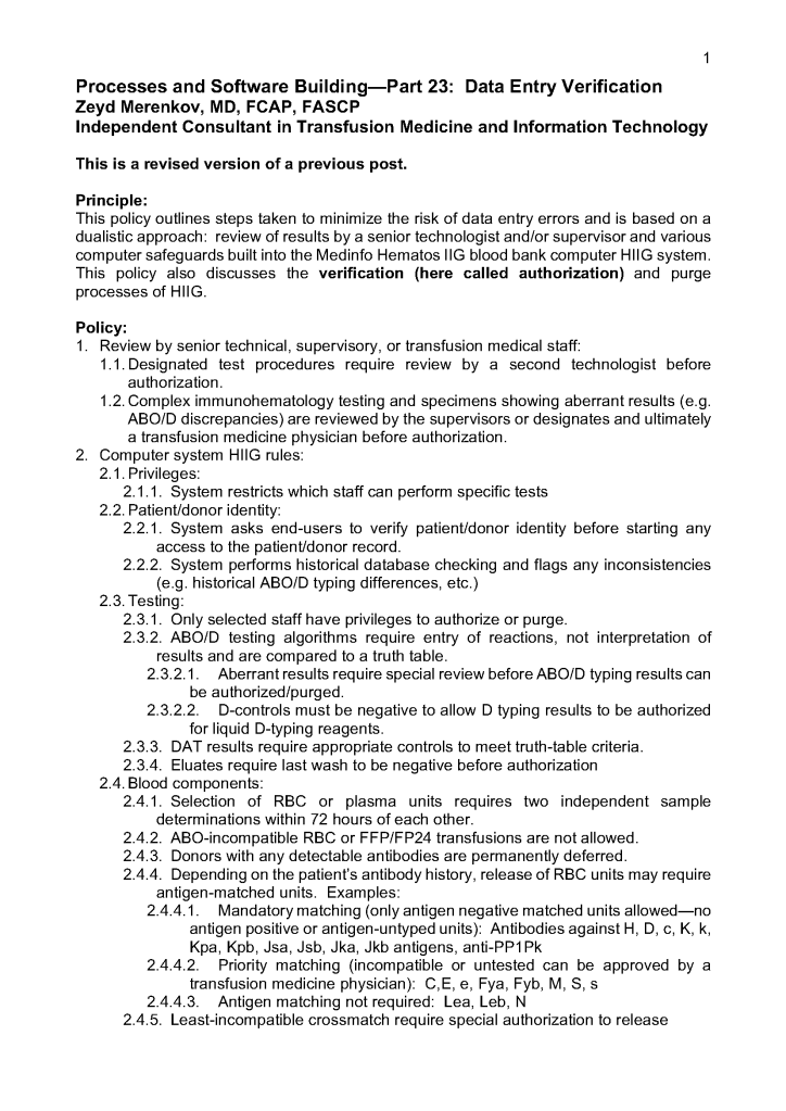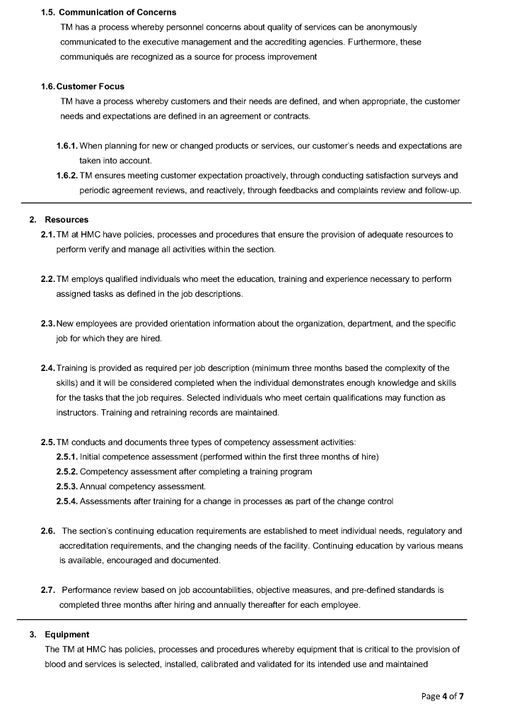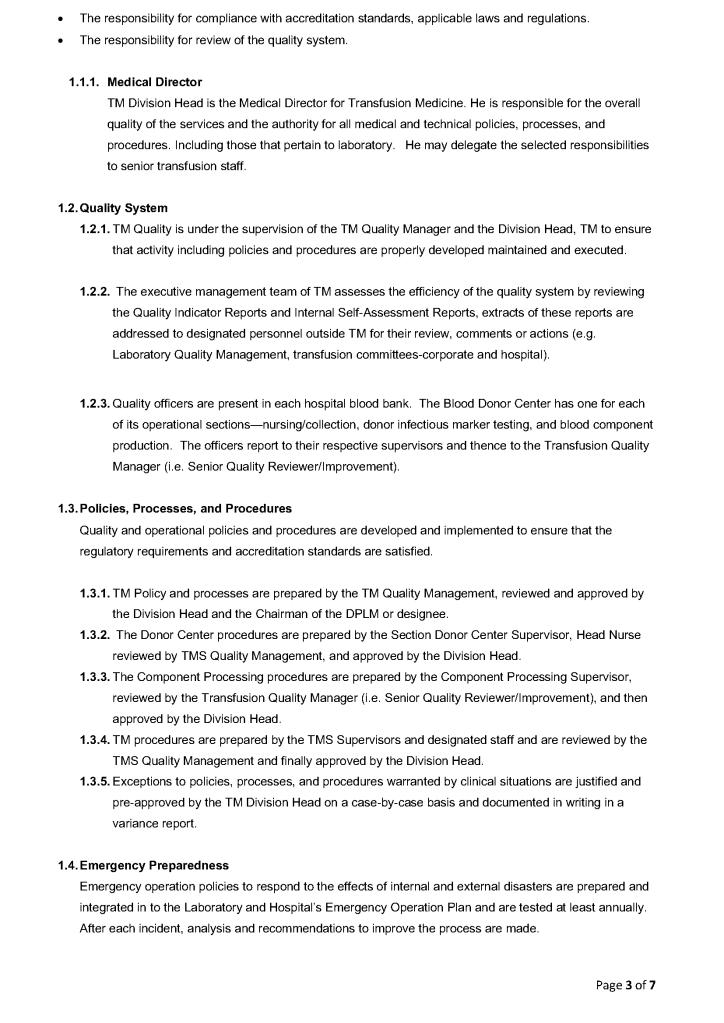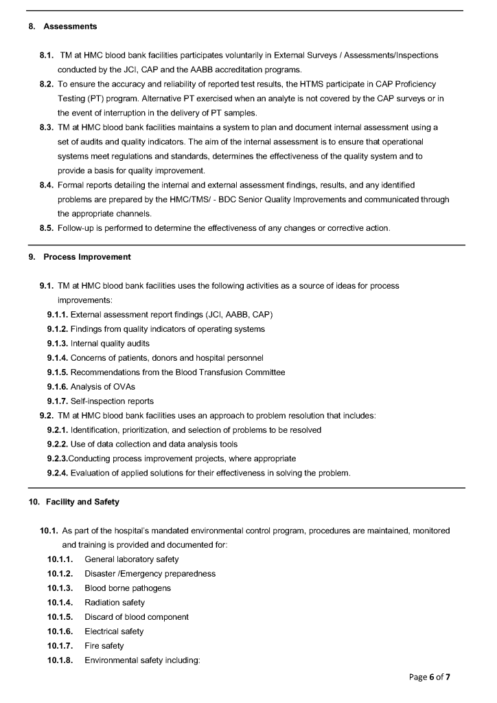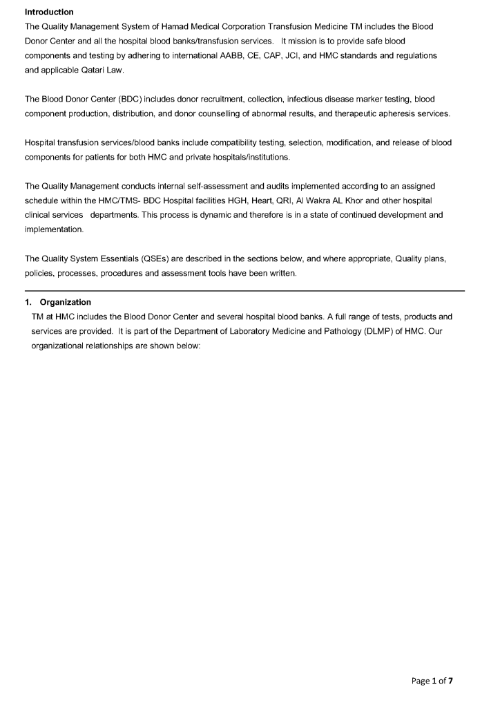 This is a sample quality system plan to comply with AABB and CAP accreditation standards that I used at HMC Doha.