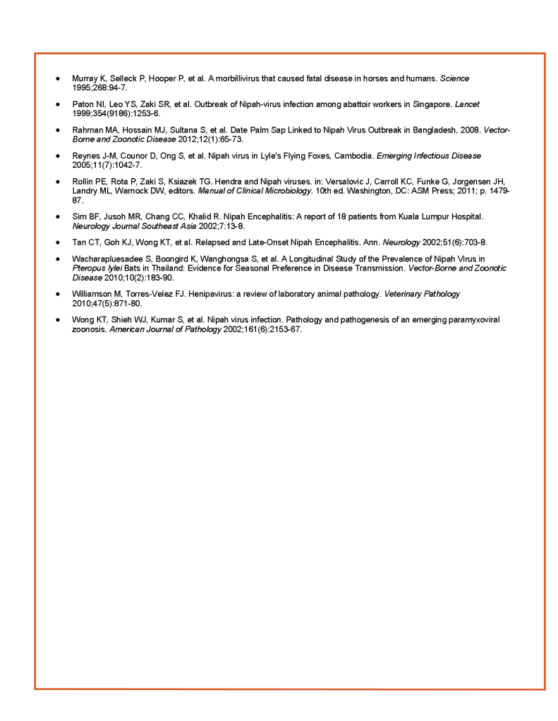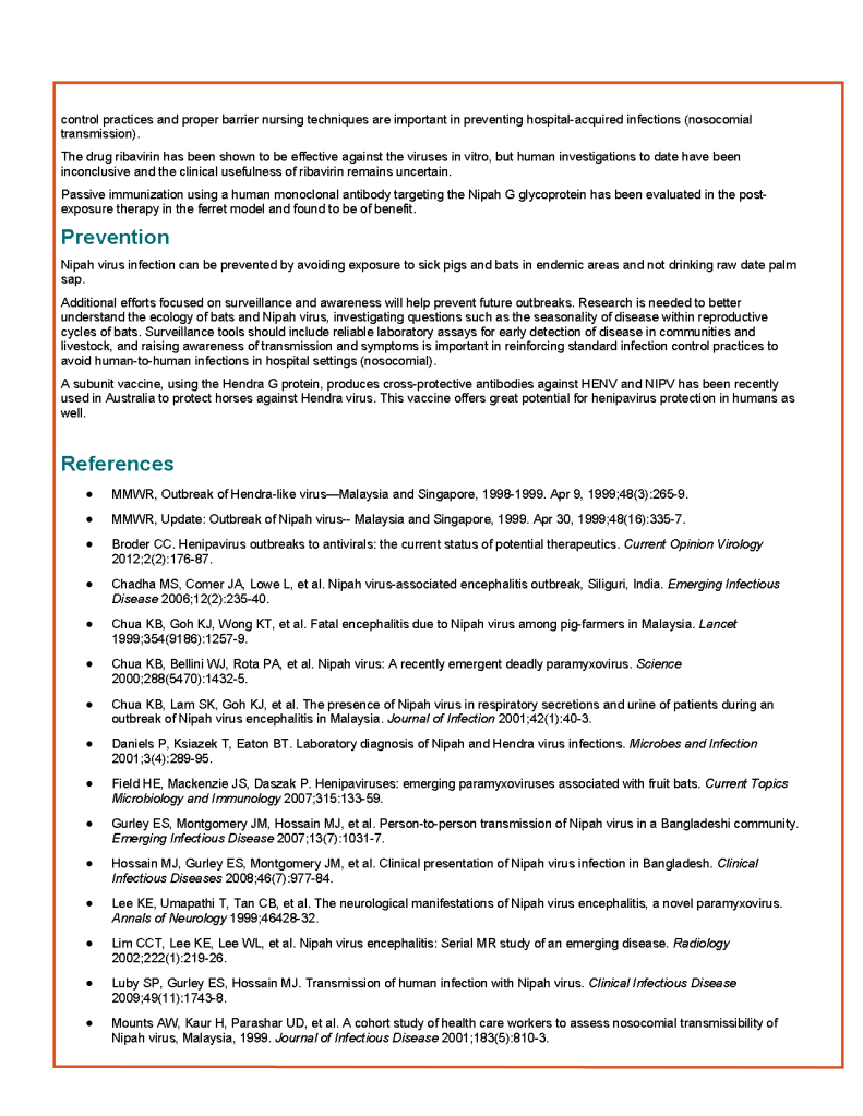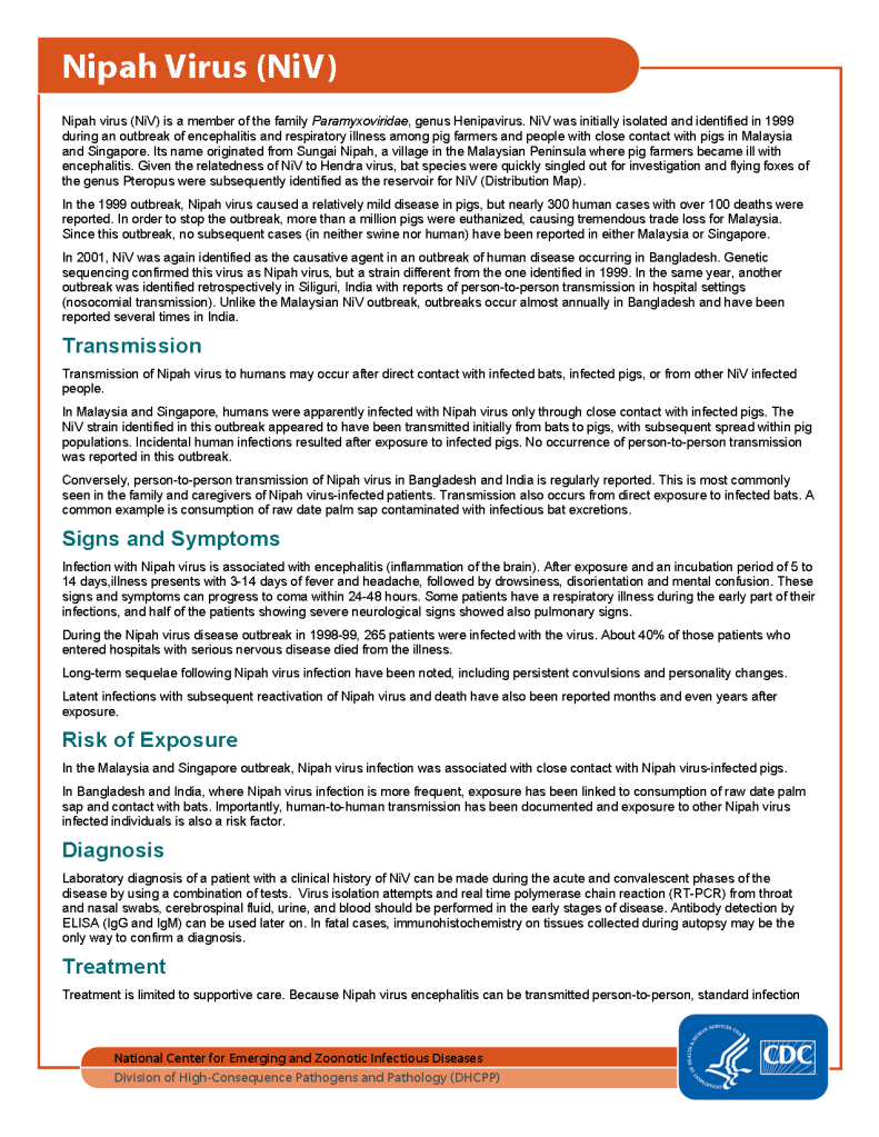 Nipah Virus Fact Sheet, Center for Disease Control, Atlanta, GA, USA—current edition—attached.