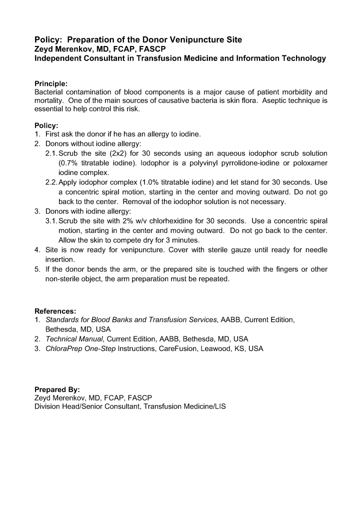 Apheresis / Donor / Teaching Policy: Preparation of the Donor Venipuncture Site Image29th Dec 202122nd Sep 2021 drzeyd Share this: Click to share on LinkedIn (Opens in new window) LinkedIn Click to share on X (Opens in new window) X Click to share on Facebook (Opens in new window) Facebook Like Loading... Related
