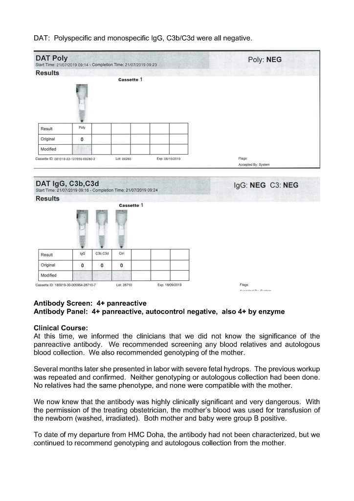 I periodically repost this panel because it is so important not to miss an anti-Jka since it may cause severe hemolysis. Routinely, I use gamma-heavy-chain-specific antiglobulin AHG reagent; but to the best of my knowledge, I have not missed an anti-Jka. In this case, there were nonspecific reactions in the panels—many panels were performed with inconclusive results. As a last resort, I used a polyspecific AHG reagent and found the antibody. I have only encountered two such antibodies in many years of practice in the Middle East.