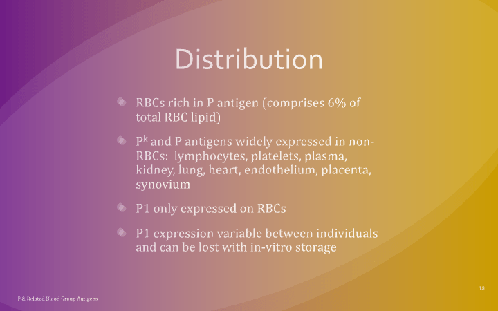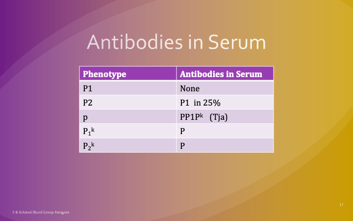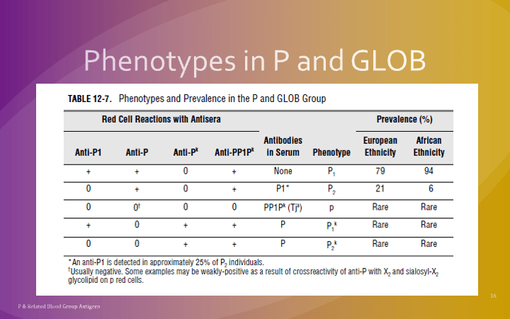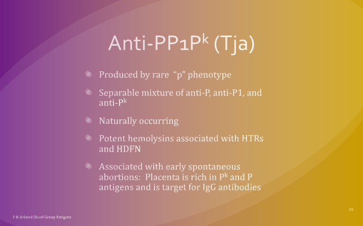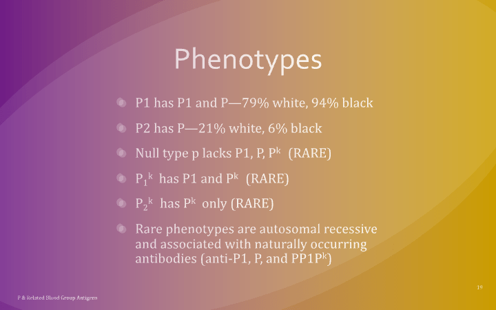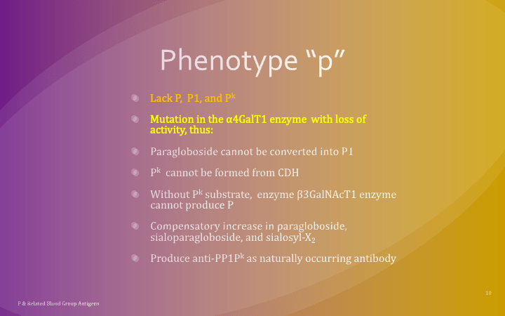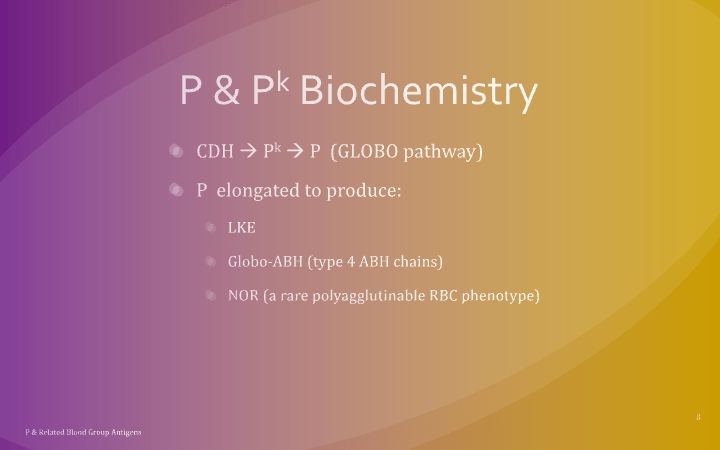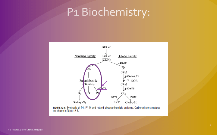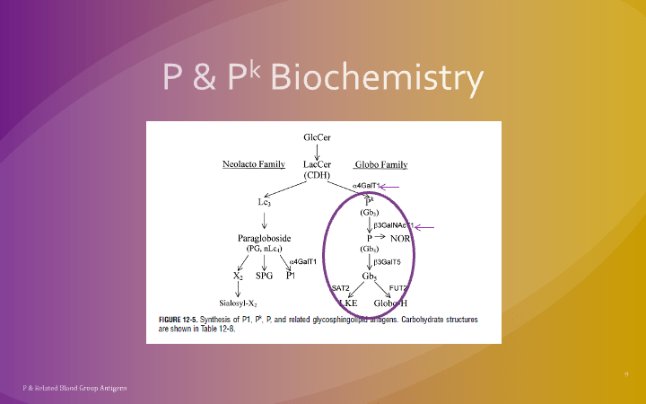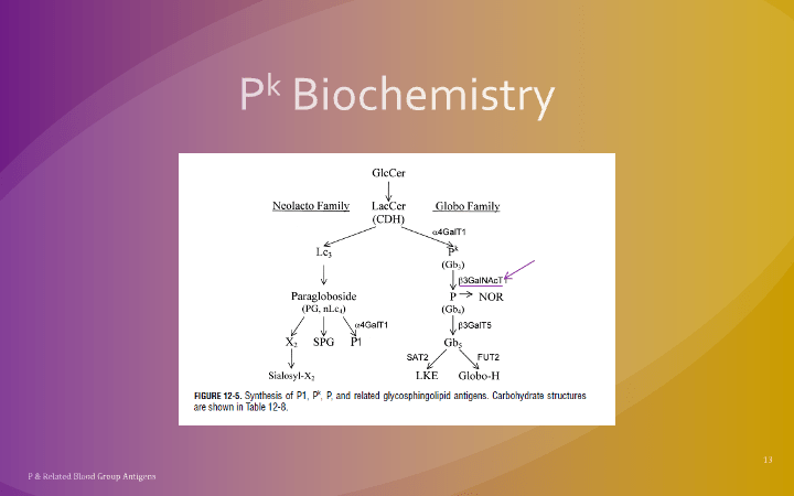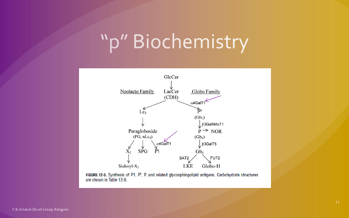 The terminology is very confusing: P1 is part of the P blood group and is not part of the globoside blood group (P, Pk). Some of the same enzymes act on both substrates, leading to even more confusing names. The pp phenotype is the result of a defective gene acting on both the P and globoside blood group. The reason I include this lecture is that the “p” phenotype is seen in the Middle East region and produces an antibody anti-PP1Pk (anti-Tja) and is one of our antibodies to a high incidence/prevalence antigen.