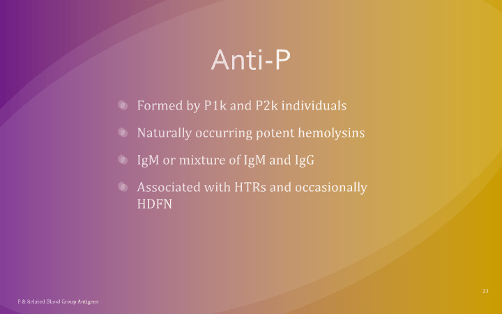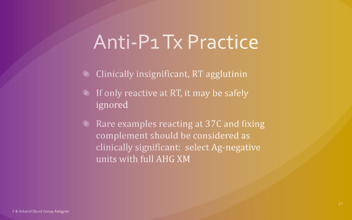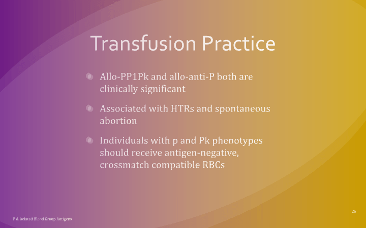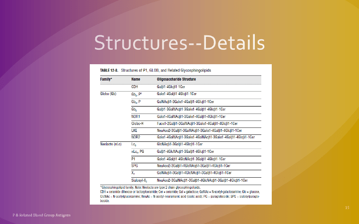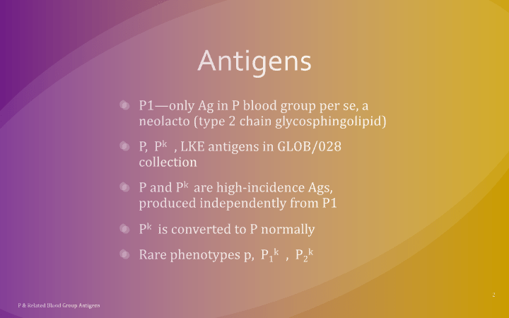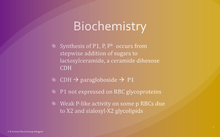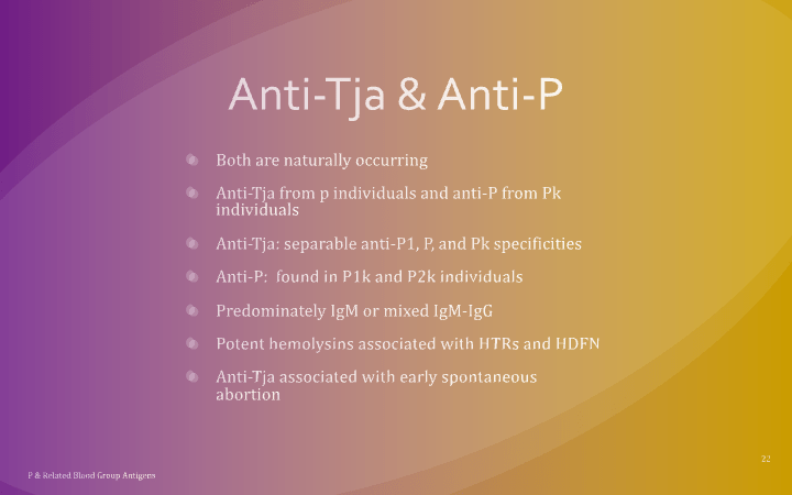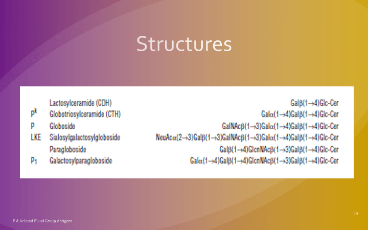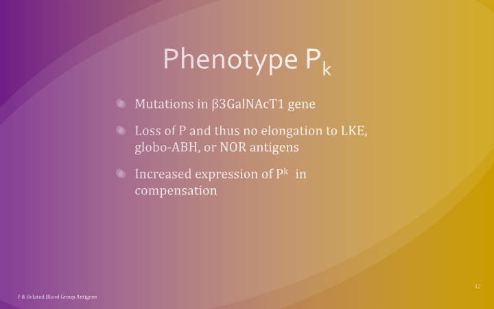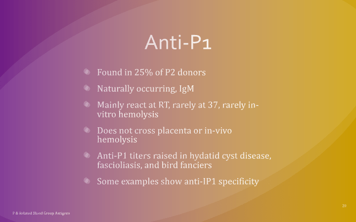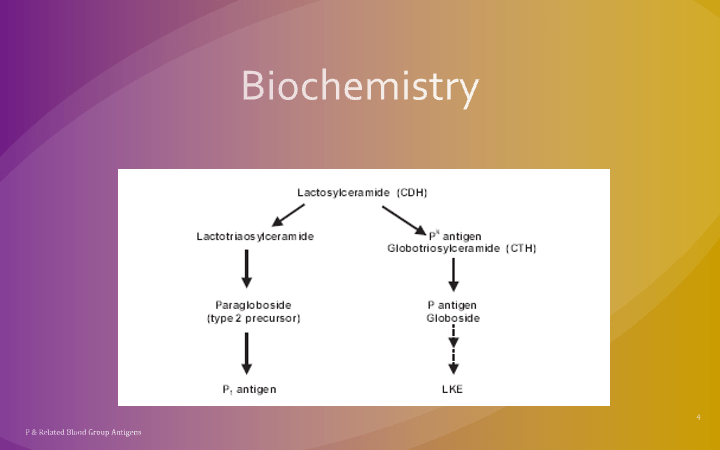 The terminology is very confusing: P1 is part of the P blood group and is not part of the globoside blood group (P, Pk). Some of the same enzymes act on both substrates, leading to even more confusing names. The pp phenotype is the result of a defective gene acting on both the P and globoside blood group. The reason I include this lecture is that the “p” phenotype is seen in the Middle East region and produces an antibody anti-PP1Pk (anti-Tja) and is one of our antibodies to a high incidence/prevalence antigen.