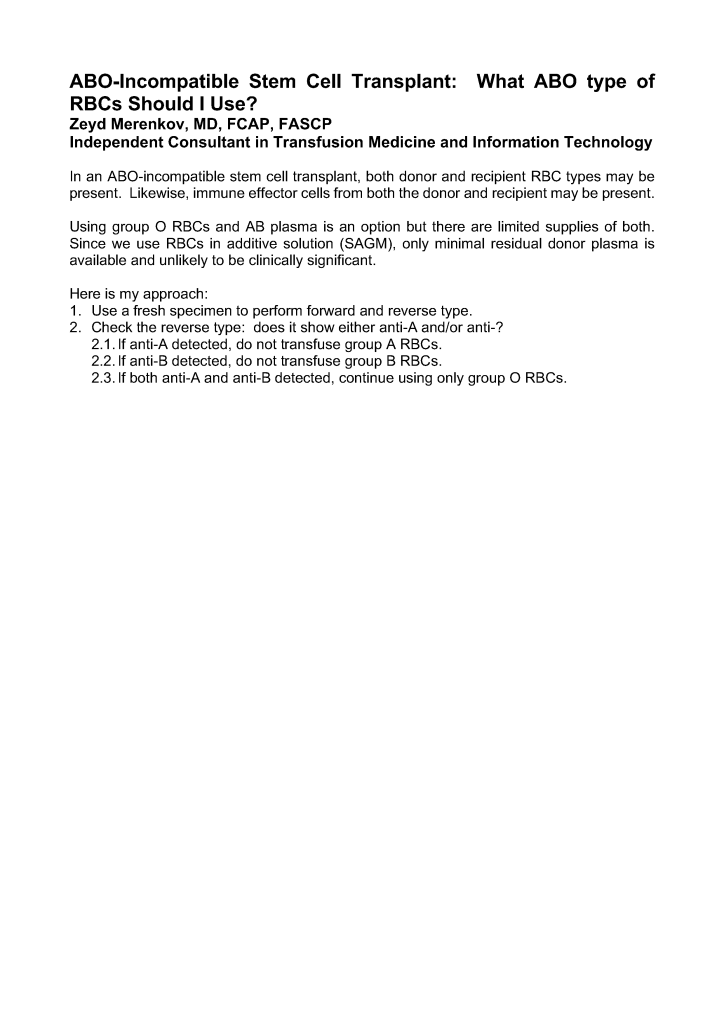 Patient / Teaching / Transplantation ABO-Incompatible Stem Cell Transplant: What ABO Type of RBCs Should I Use? Image11th Jan 20234th Aug 2022 drzeyd Share this: Click to share on LinkedIn (Opens in new window) LinkedIn Click to share on X (Opens in new window) X Click to share on Facebook (Opens in new window) Facebook Like Loading... Related