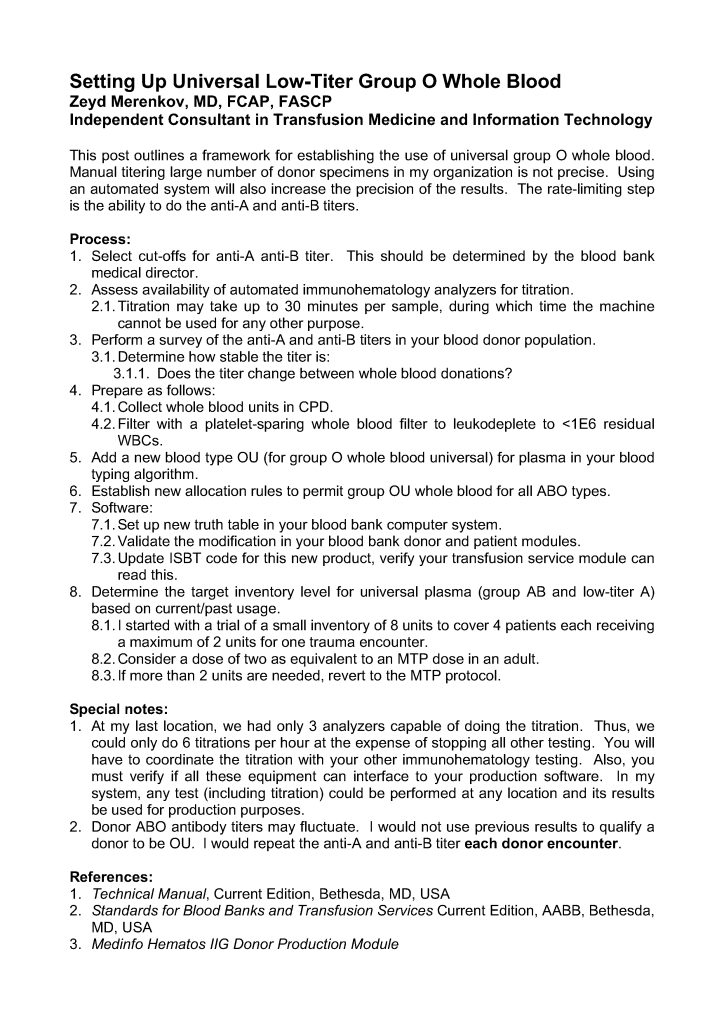 Blood Bank IT / Donor / Patient / Teaching Framework for Universal, Low-Titer Group O Whole Blood Image17th Jun 202416th Nov 2023 drzeyd Share this: Click to share on LinkedIn (Opens in new window) LinkedIn Click to share on X (Opens in new window) X Click to share on Facebook (Opens in new window) Facebook Like Loading... Related