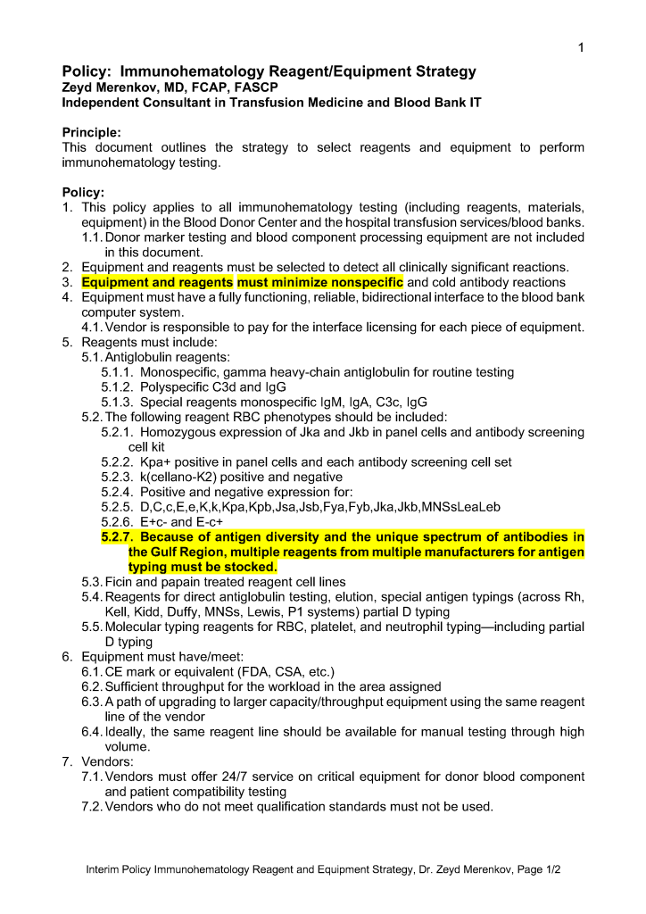 Immunohematology Equipment and Reagent Strategy