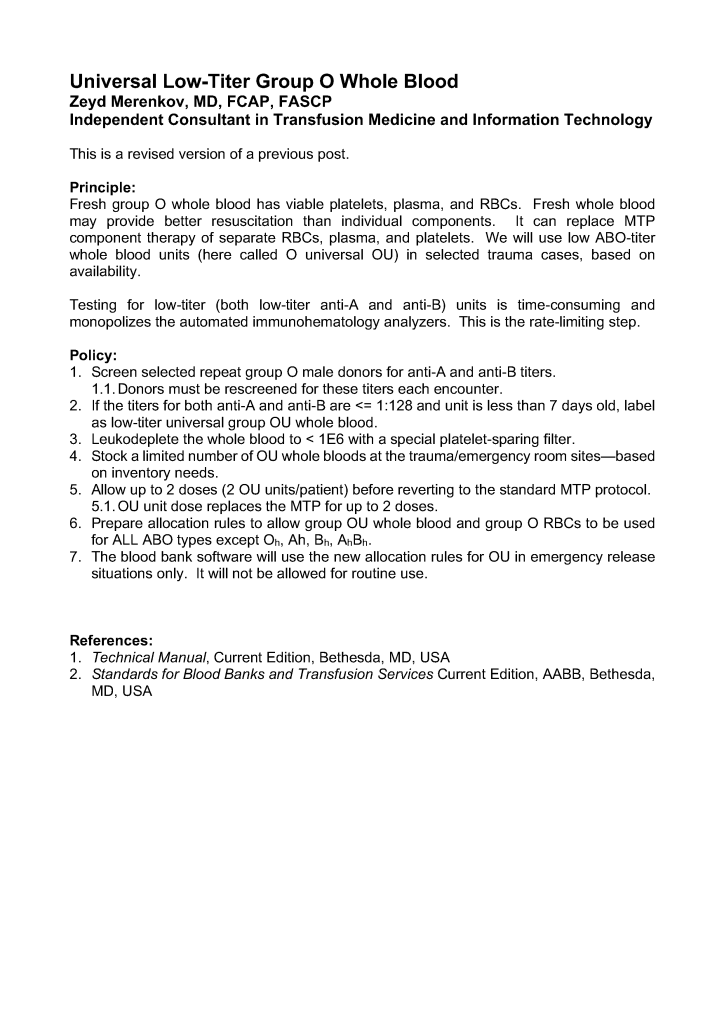 Blood Bank IT / Donor / Teaching Universal, Low-Titer Fresh Group O Whole Blood Image17th Oct 202418th Mar 2024 drzeyd Share this: Click to share on LinkedIn (Opens in new window) LinkedIn Click to share on X (Opens in new window) X Click to share on Facebook (Opens in new window) Facebook Like Loading... Related