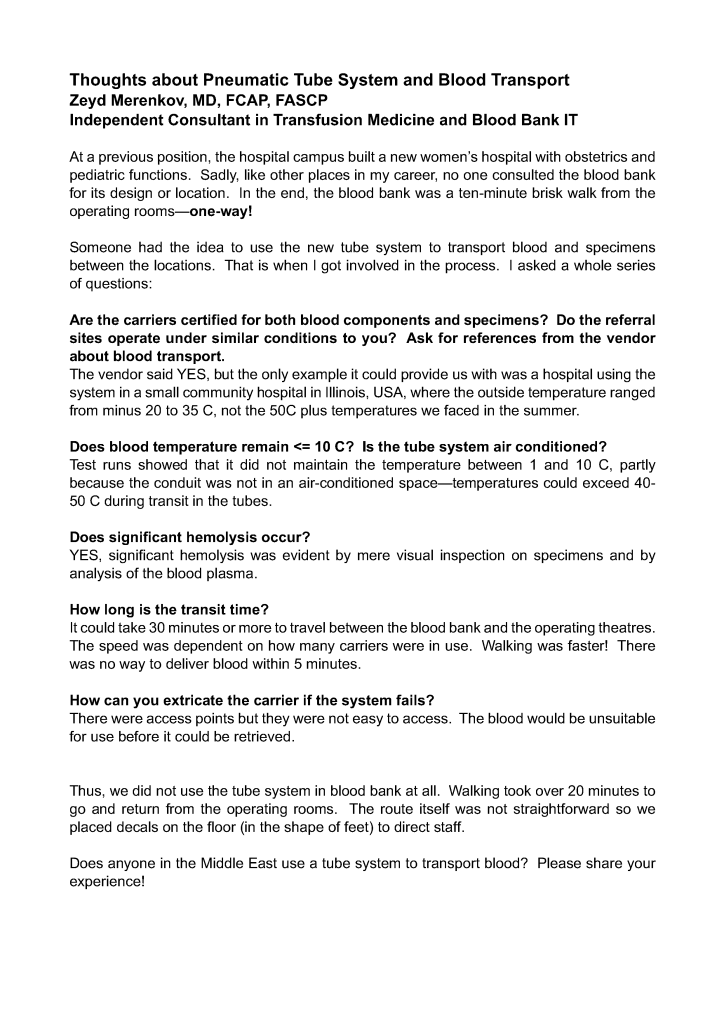 Administration / Patient / Teaching Pneumatic Tube Systems for Blood Transport: My Experience Image27th Nov 20245th May 2024 drzeyd Share this: Click to share on LinkedIn (Opens in new window) LinkedIn Click to share on X (Opens in new window) X Click to share on Facebook (Opens in new window) Facebook Like Loading... Related