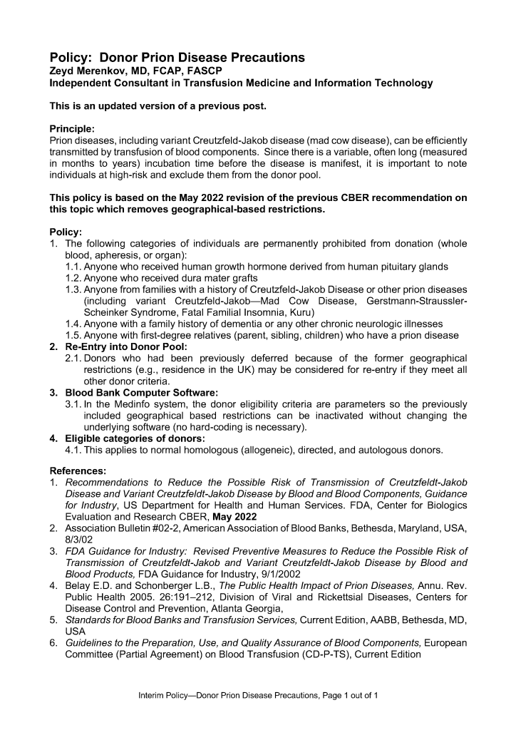 Blood Bank IT / Donor / Teaching / Tissue Policy: Prion Diseases Image17th Jul 202522nd Dec 2024 drzeyd Share this: Click to share on LinkedIn (Opens in new window) LinkedIn Click to share on X (Opens in new window) X Click to share on Facebook (Opens in new window) Facebook Like Loading... Related
