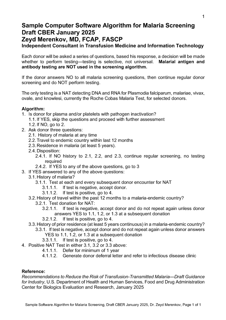 Accreditation / Administration / Apheresis / Blood Bank IT / Donor / Patient / Plasma / Teaching Sample Computer Algorithm CBER Draft Malaria Guidance Jan-2025 Image15th Oct 202512th Mar 2025 drzeyd Share this: Click to share on LinkedIn (Opens in new window) LinkedIn Click to share on X (Opens in new window) X Click to share on Facebook (Opens in new window) Facebook Like Loading... Related