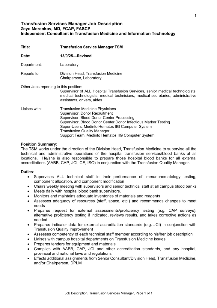 Accreditation / Administration / Blood Bank IT / Patient / Patient Blood Management / Teaching Job Description: Transfusion Service Manager Image29th Mar 202613th Sep 2025 drzeyd Share this: Share on LinkedIn (Opens in new window) LinkedIn Share on X (Opens in new window) X Share on Facebook (Opens in new window) Facebook Like Loading... Related