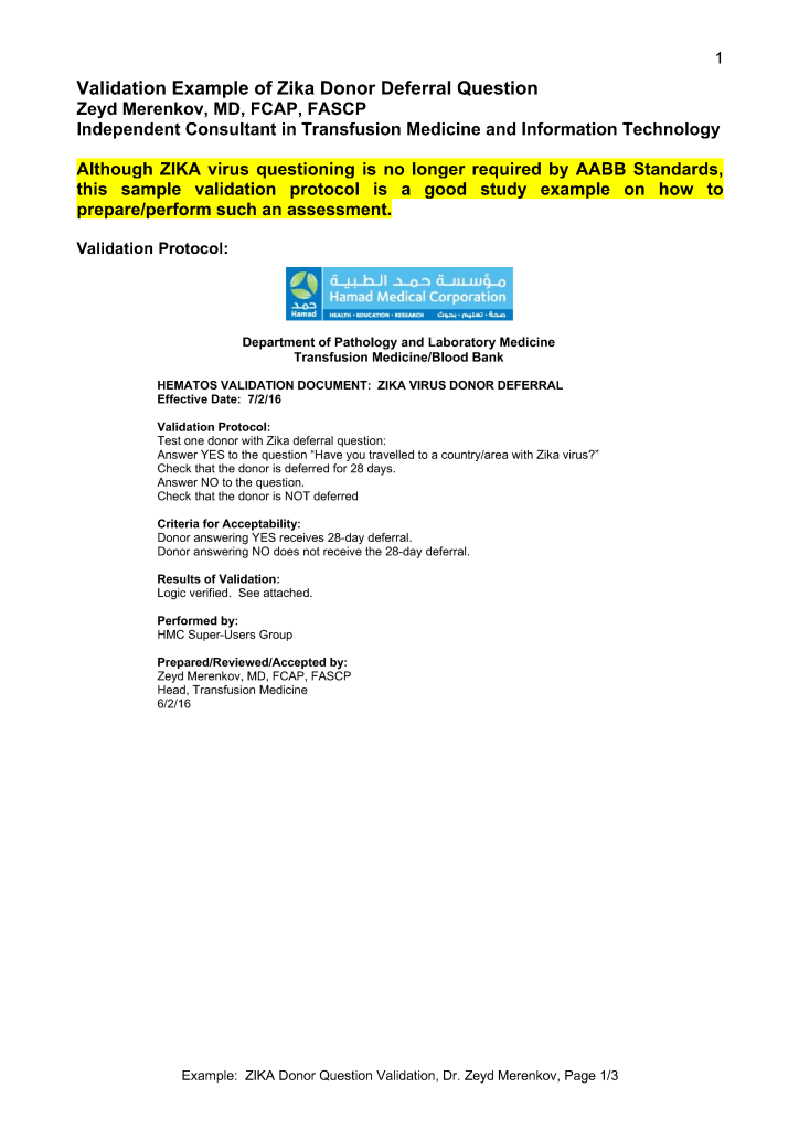 Although ZIKA screening is no longer required by US FDA/AABB, the validation of modifying the donor question is useful to teach to the principles of validation: