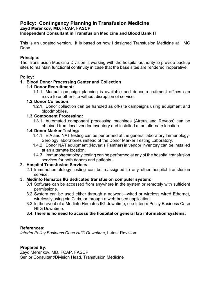 This document was prepared to summarize for the laboratory accreditation inspectors and AABB assessors our contingency planning.