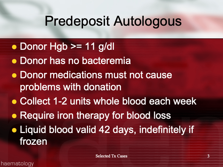 Preoperative collection can make available packed red blood cells, whole blood, platelets, FFP, and/or cryoprecipitate. However, at most two units of blood per week can be collected. RBC’s can be stored for up to 42 days in the liquid state, frozen RBC’s up to ten years, platelets up to five days, and fresh frozen plasma and cryoprecipitate up to one year. The last collection cannot be less than 72 hours prior to the surgery time. Units can be collected as long as the patient’s hematocrit remains above 33%. Supplemental iron and erythropoietin can increase the number of units harvested. The biggest obstacle to using this service is the coordination of the patient scheduling for this procedure. The blood bank does not have the resources to prospectively analyze the surgical scheduling and make the various appointments, contact the attending physician, etc. Thus, this service is vastly underutilized.