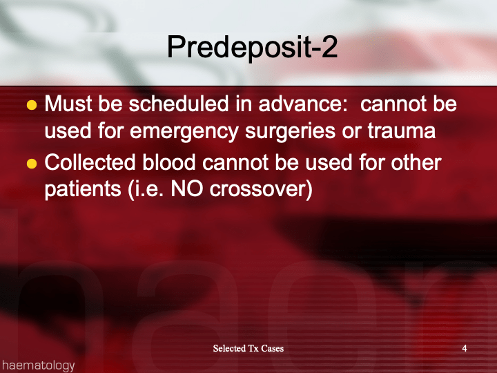 Note that perioperative and intraoperative material can only be transfused up to six or eight hours at room temperature or 24 hours if refrigerated at 1-6 degrees (depending on the method used) post collection to minimize the risk of infection. Intraoperative collection is usually contraindicated in cases of cancer and if the bowel has been violated.