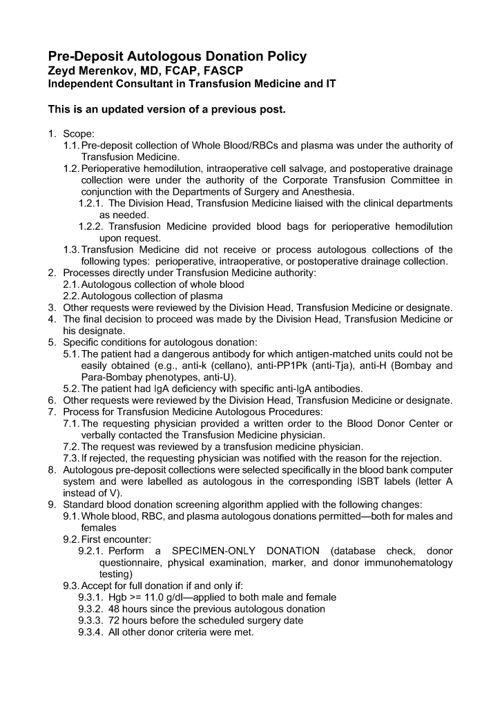 This is the process I developed for HMC Doha. The Medical Director (here Head, Transfusion Medicine HTM) is actively involved in the development of policies, processes, and procedures for ALL types of autologous donation in conjunction with the National Transfusion Committee NTC.