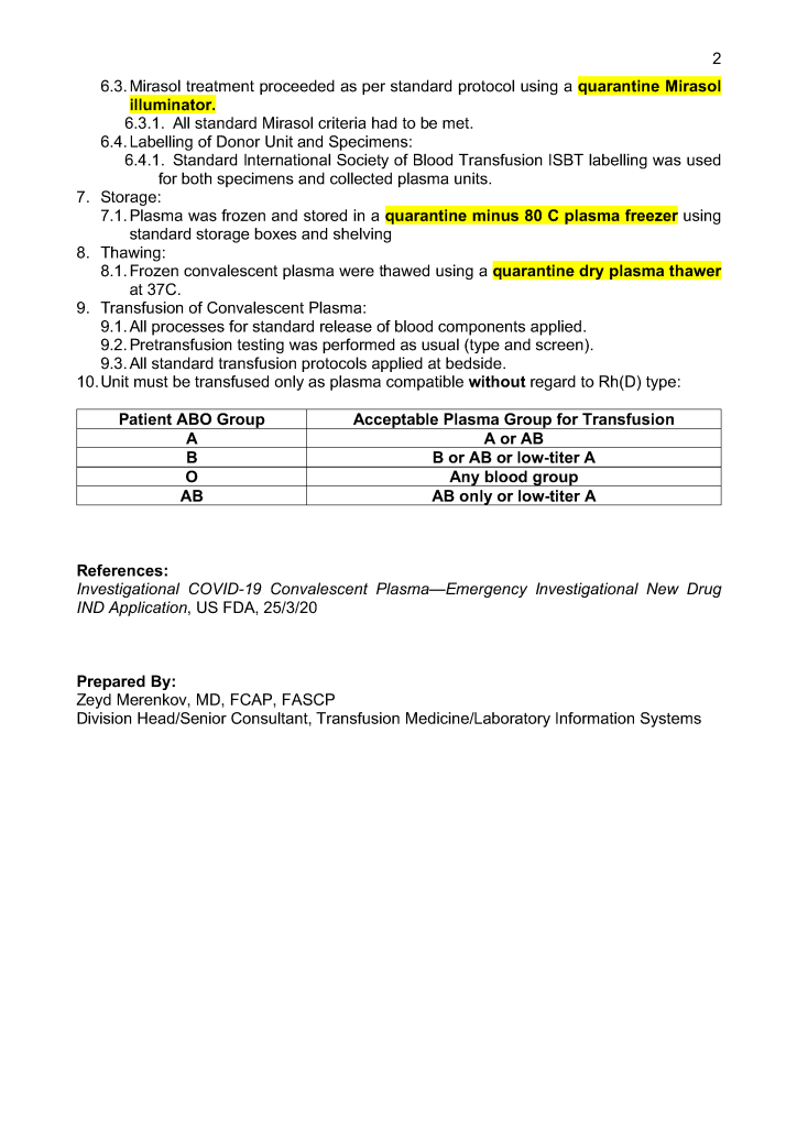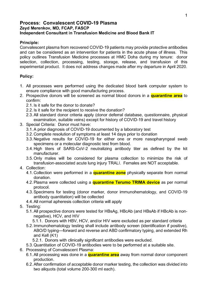 Covid Convalescent Plasma CCP Production in Qatar: Winter 2020