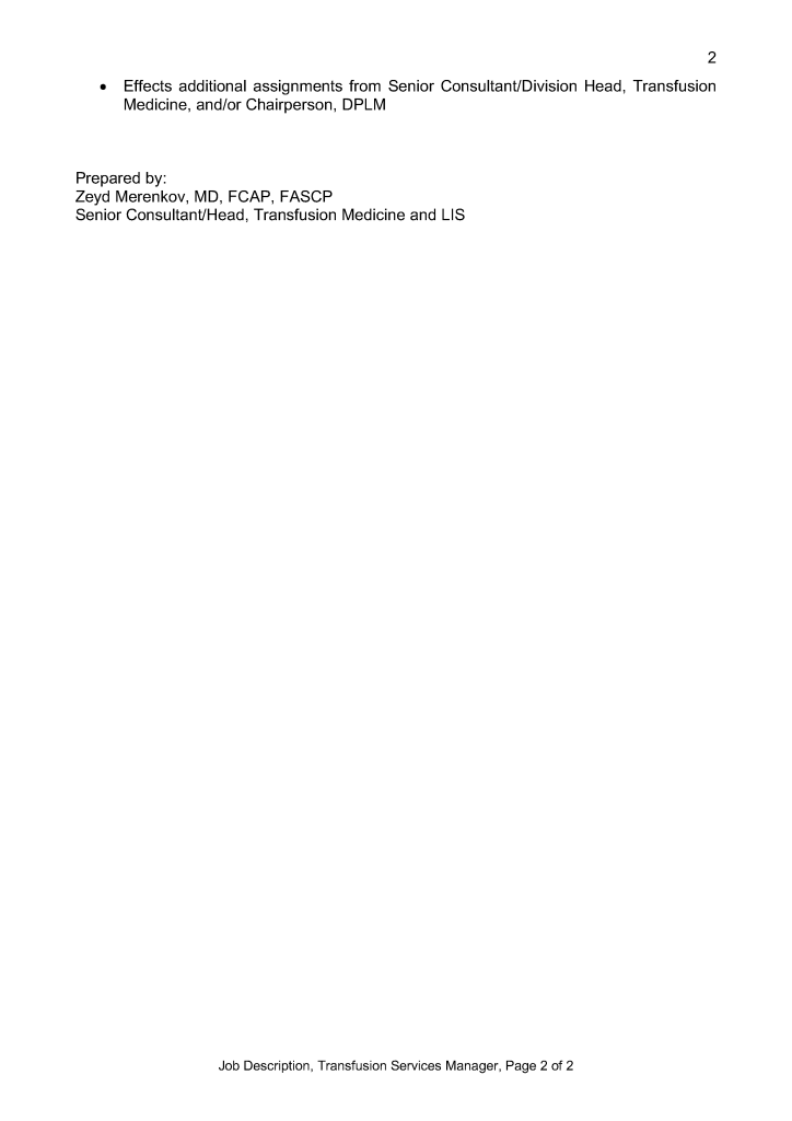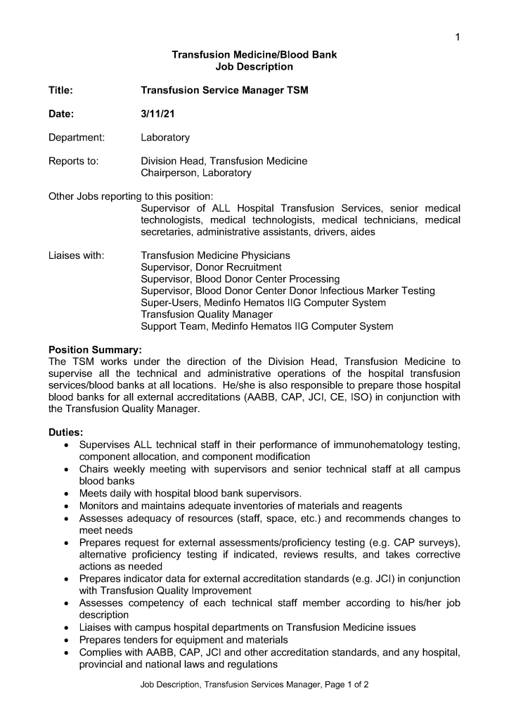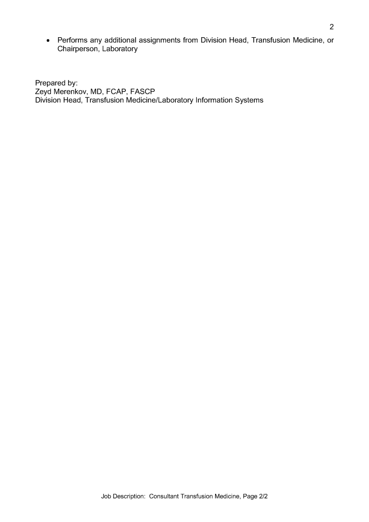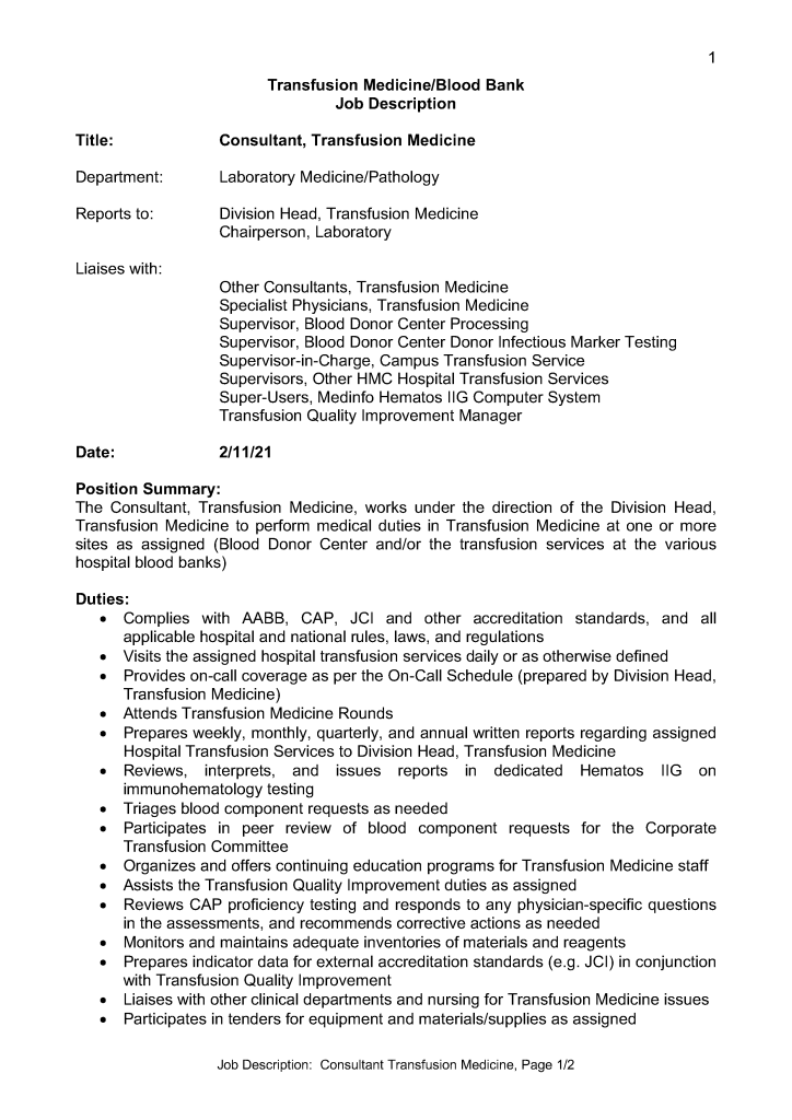 Job Description: Consultant Transfusion Medicine 16th Feb 20222nd Nov 2021 drzeyd This is a sample generalized version job description that I prepared from a previous position.