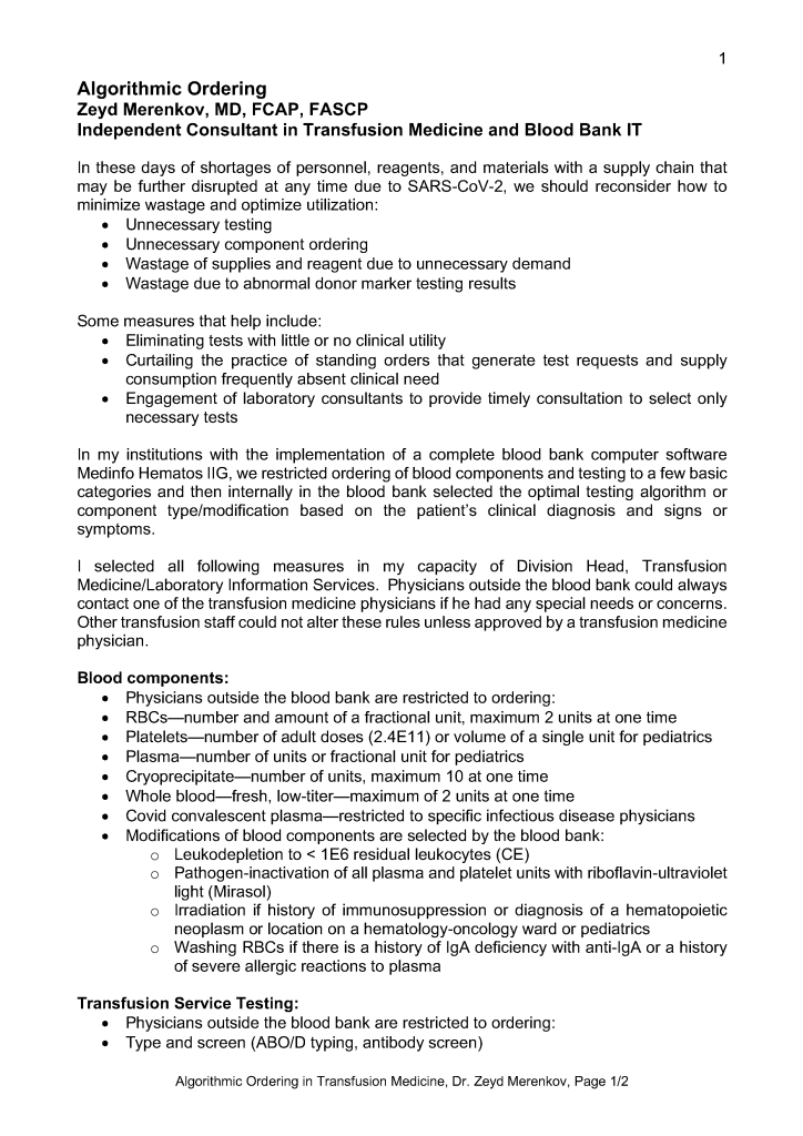Transfusion Medicine, Blood Bank IT, Pathogen Inactivation, Plasma Fractionation, COVID-19 Convalescent Plasma Production