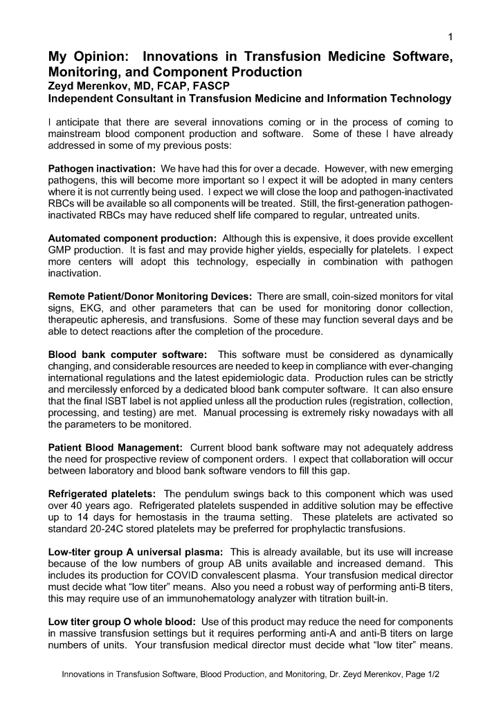 Transfusion Medicine, Blood Bank IT, Pathogen Inactivation, Plasma Fractionation, COVID-19 Convalescent Plasma Production